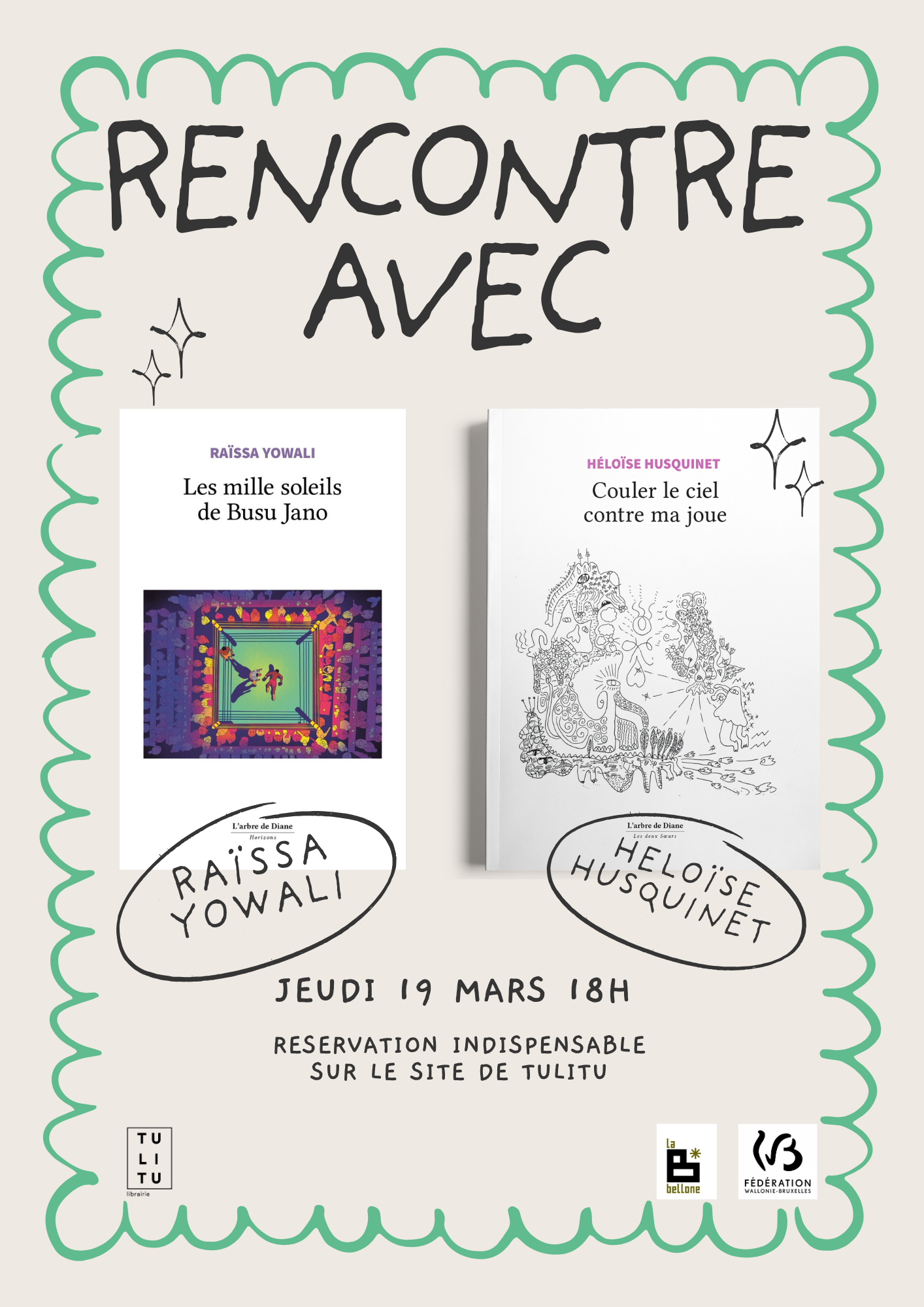 Quelle joie d’accueillir Raïssa Yowali et Héloïse Husquinet pour un échange à propos de leur recueil paru à l’Arbre de Diane : Les mille soleils de Busu Jano pour Raïssa et Couler le ciel contre ma joue pour Héloïse.